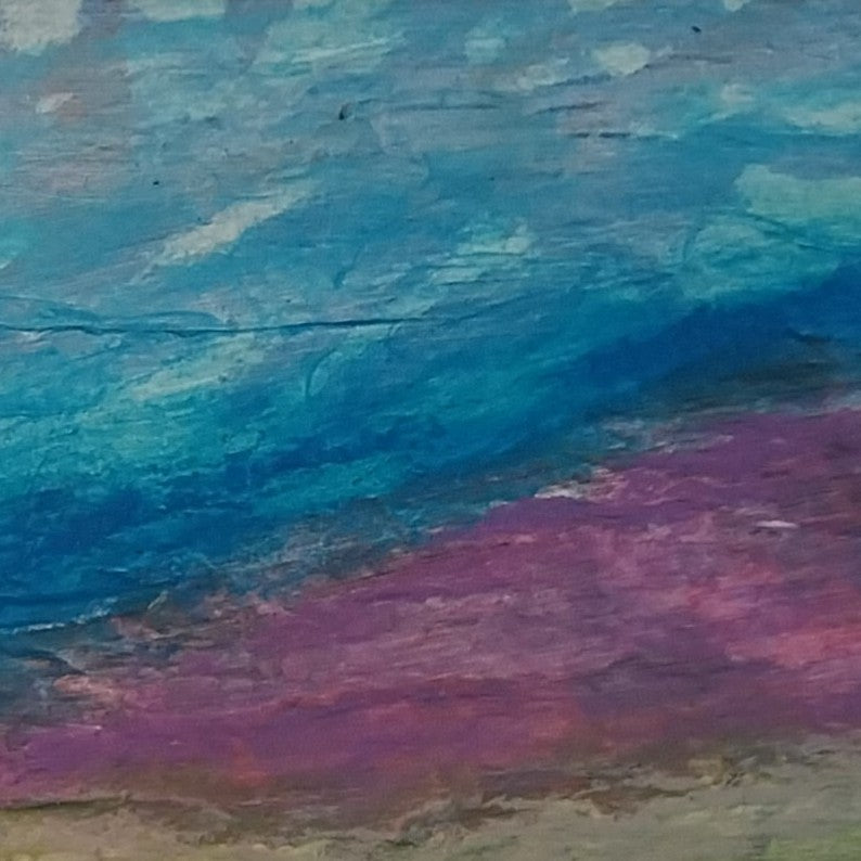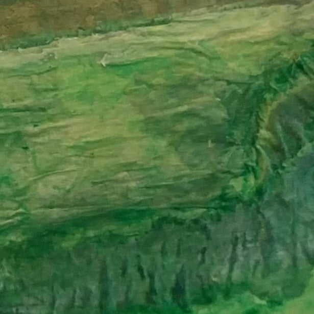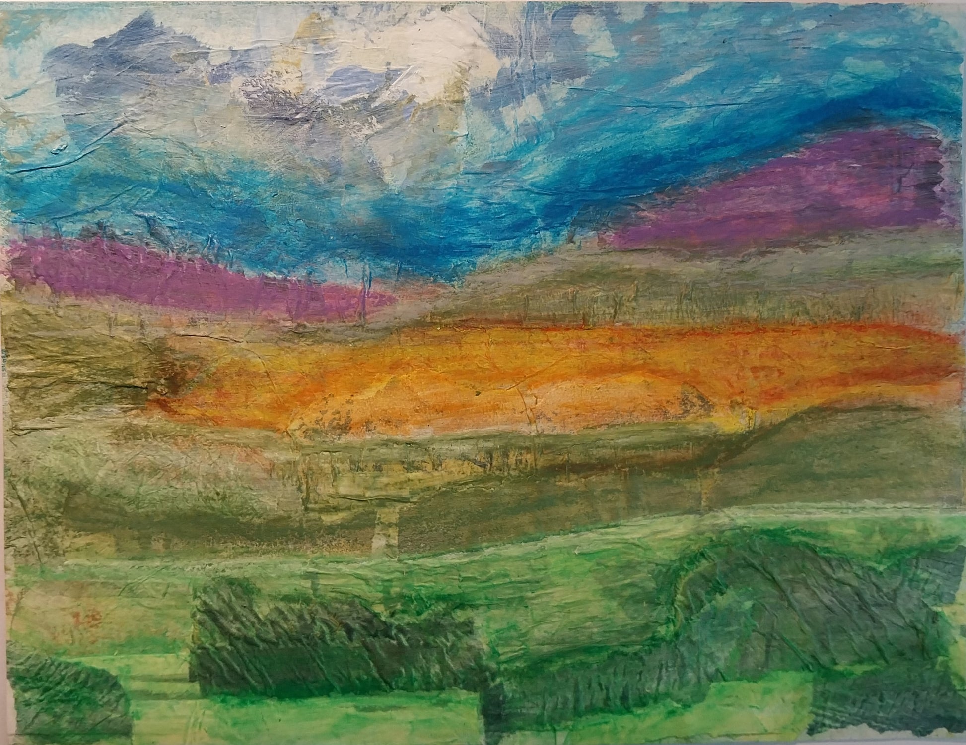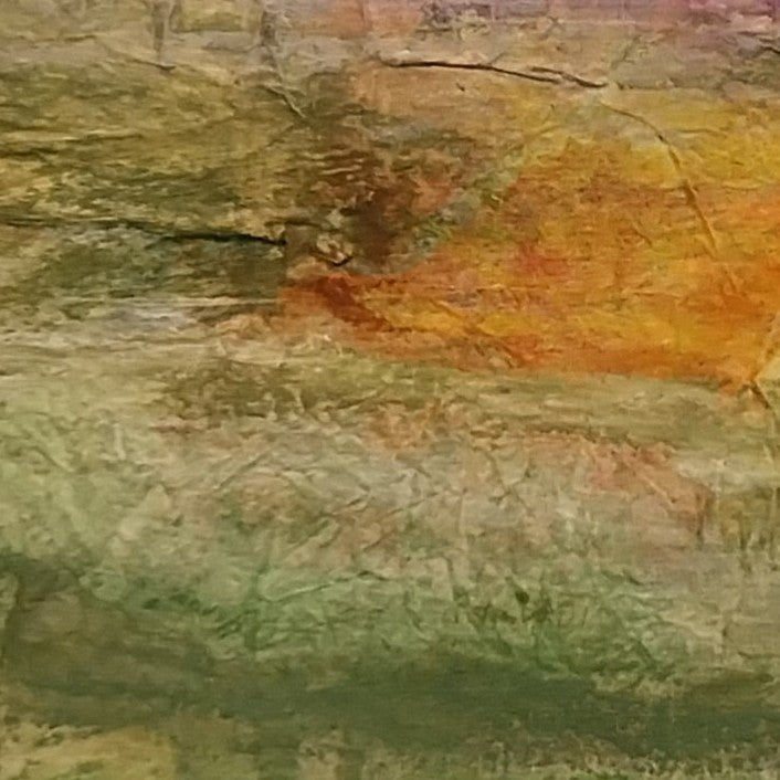 This artwork was made with acrylic and watercolour paints, and collage using various papers including painted tissue and painted deli paper. The use of mixed media captures the textures and visual interest of the landscape it was inspired by.